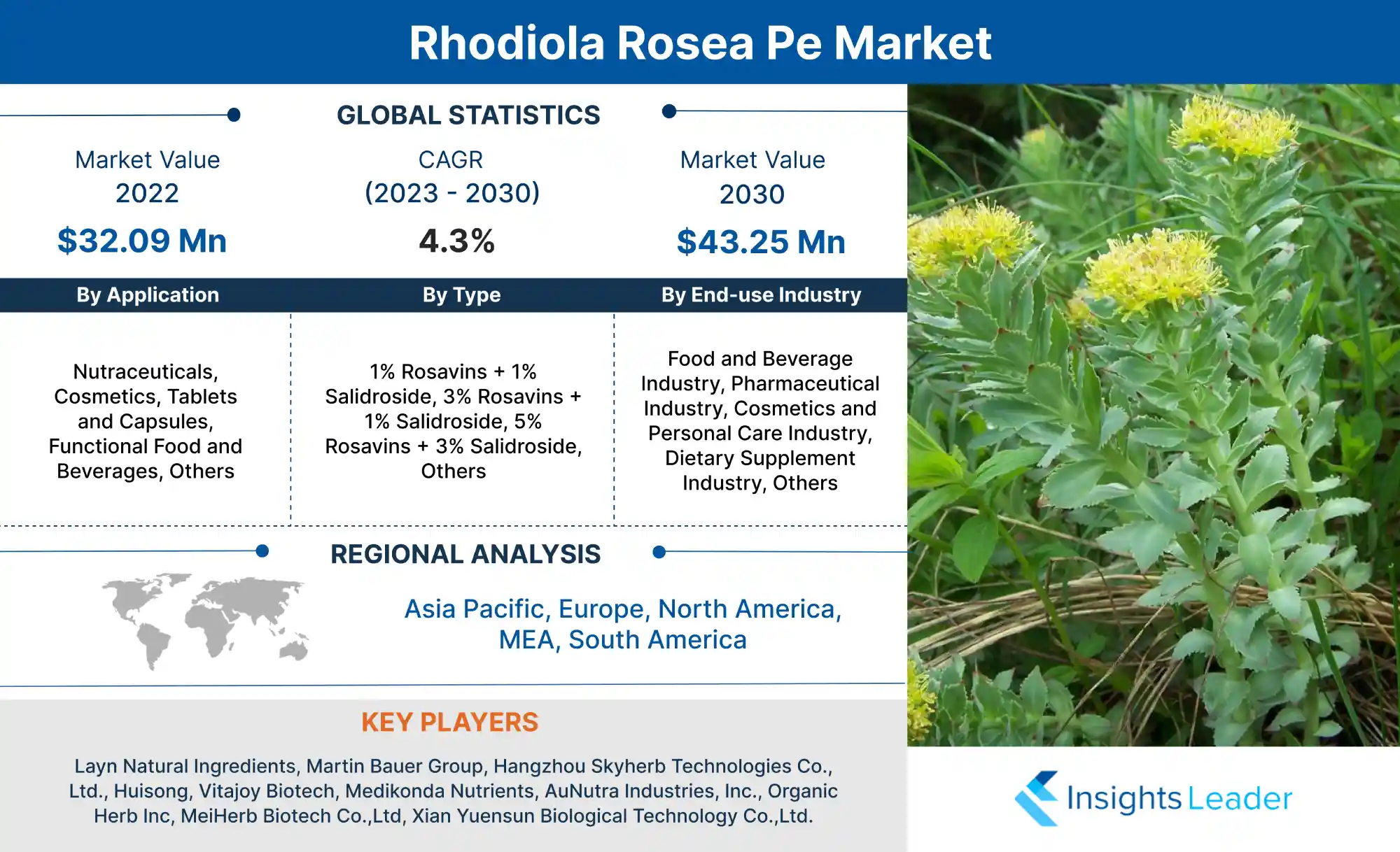 Rhodiola Rosea Pe Markt Grootte USD 43.25 Mn in 2032